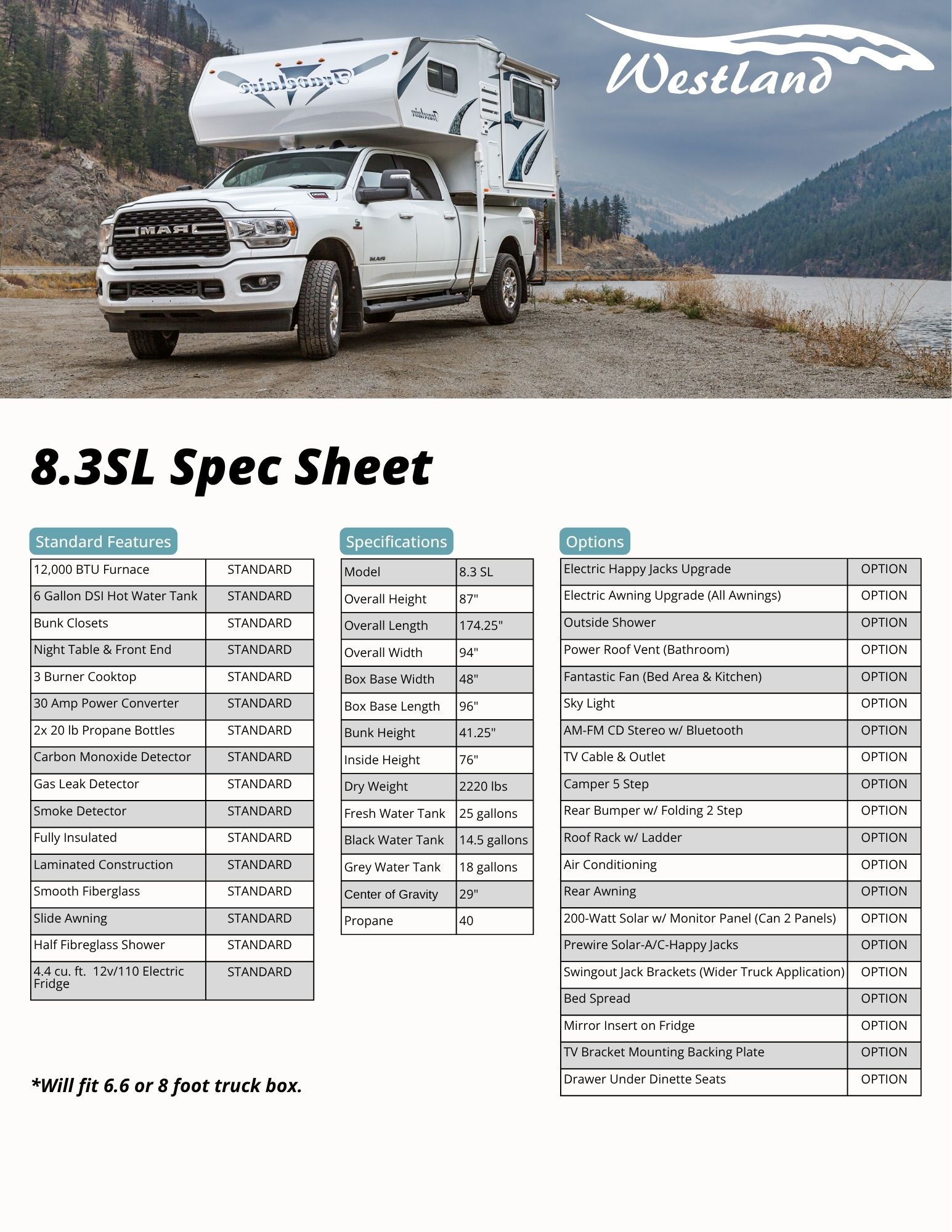 The 83SL truck camper is our lightest model with a slide designed to offer both comfort and functionality for your adventures. With a 4-foot box base and an 8-foot box length, it provides a spacious, well-organized interior. The 94-inch overall width and 87-inch overall height, paired with a 41.25-inch bedroom height, create a generous living space that allows for plenty of room to move. Inside, the 76-inch height ensures ample headroom, while the 2220 lb dry weight and 29-inch centre of gravity strikes the perfect balance between lightweight construction and rugged durability. Equipped with smart storage solutions, the 83SL is perfect for both quick getaways and extended off-grid journeys. Built to last, this camper is your perfect choice for seamless exploration!